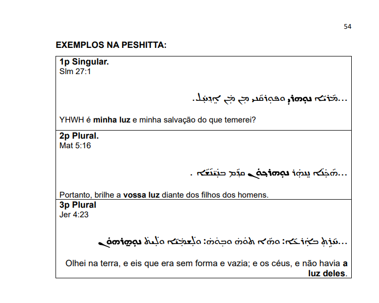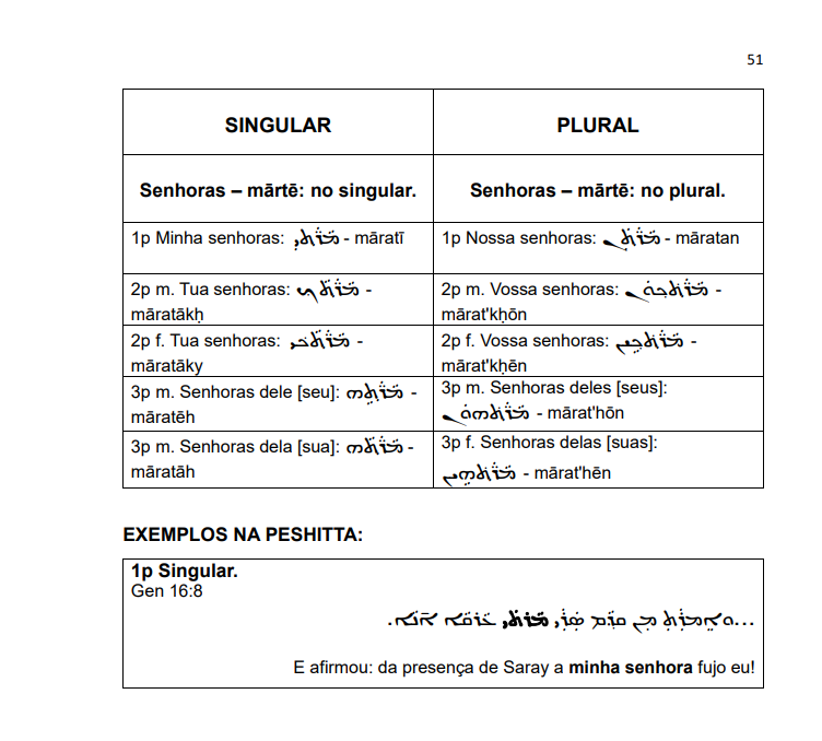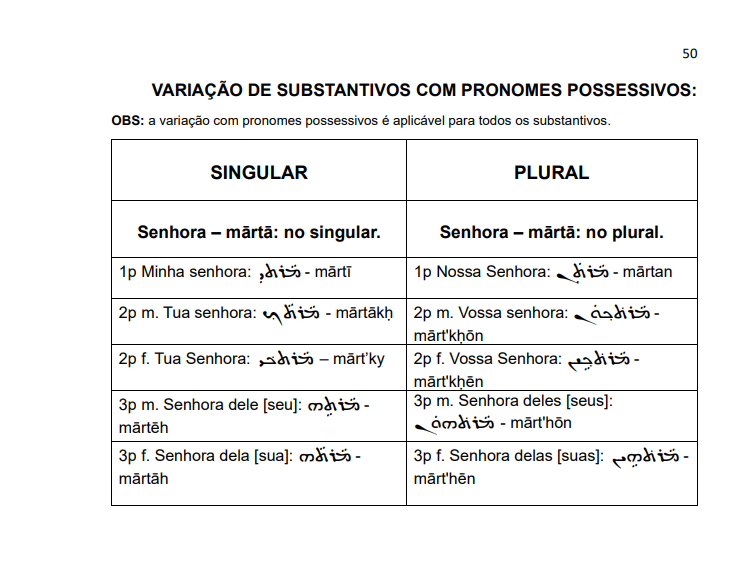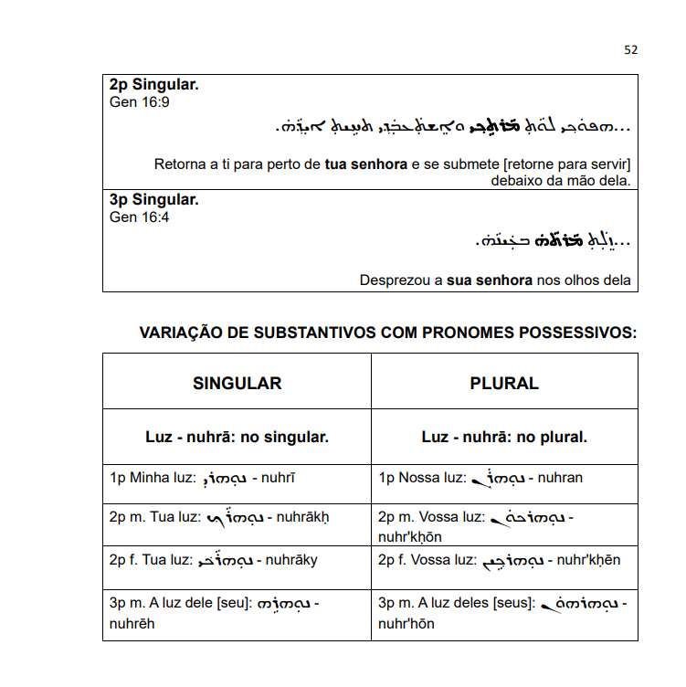 As variações de substantivos são uma característica das línguas semíticas; onde o pronome possessivo vem fixado no final do substantivo assim como ocorre com os verbos.